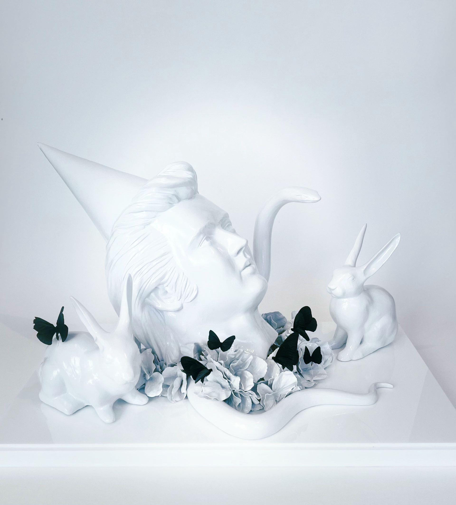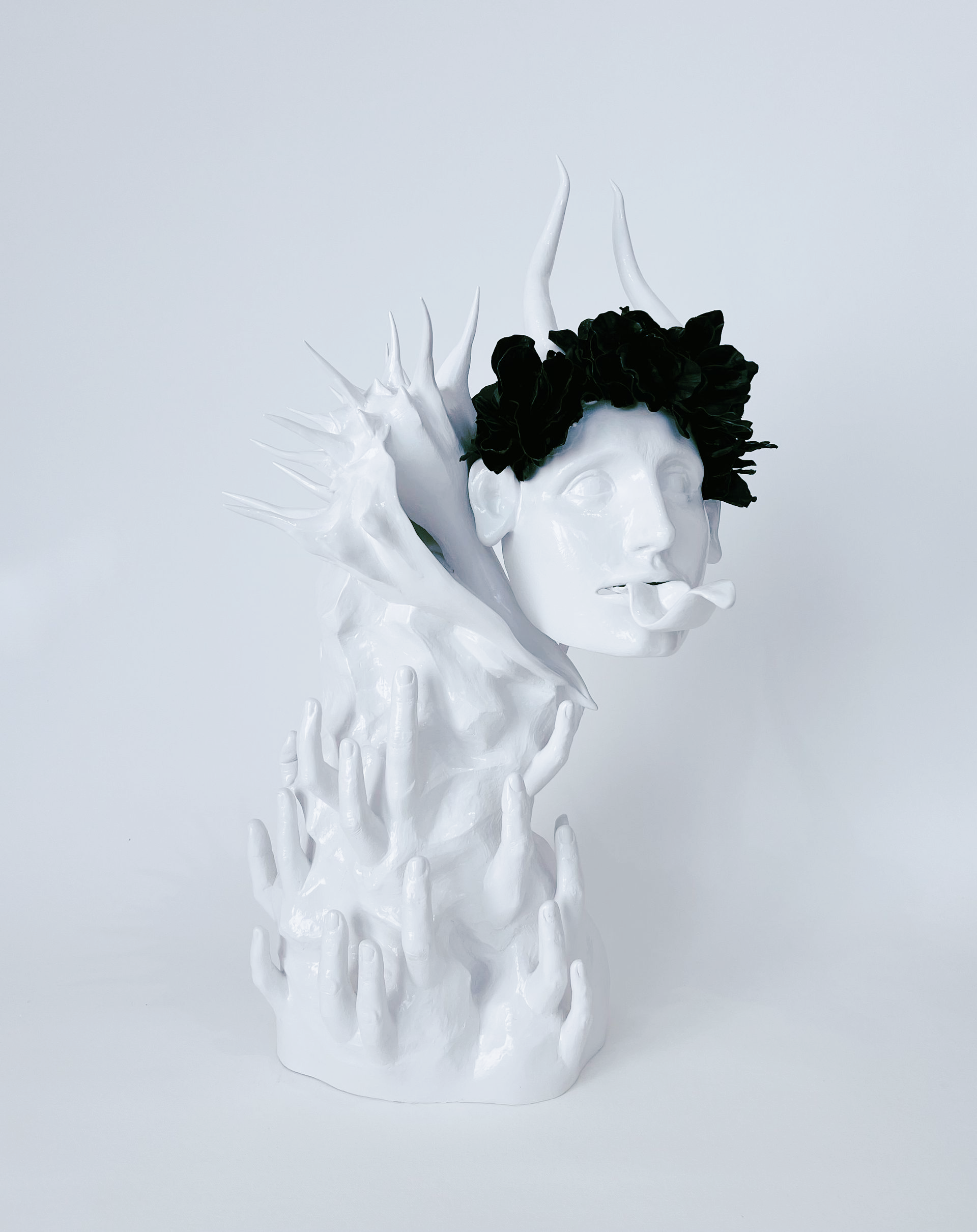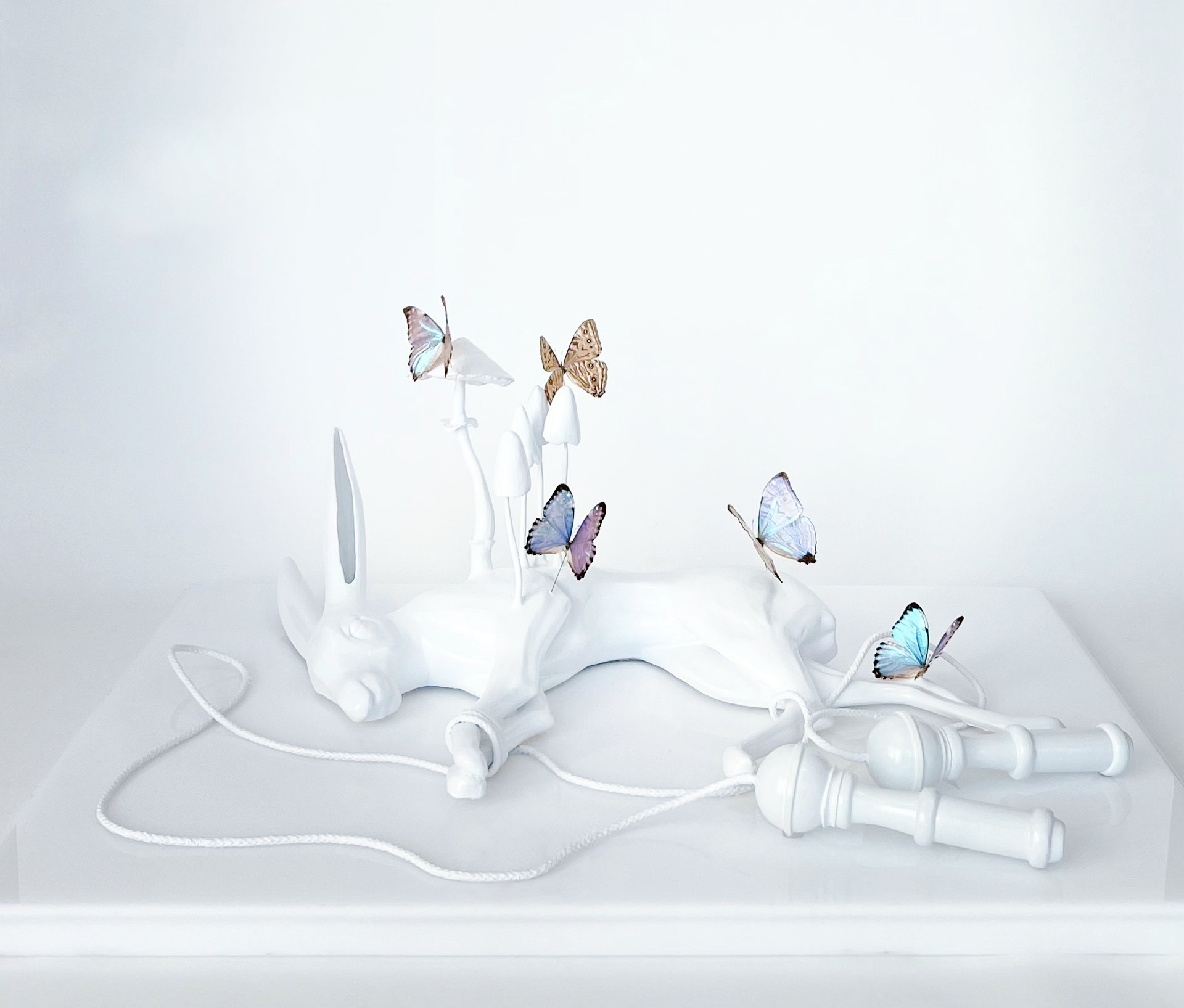 Several contradictory themes are explored, such as delicacy and fragility, sustainability versus the evanescence of beings and things. The silence of these scenes exudes the beauty of the materials that confront each other: the finesse of the shapes and the roughness of the materials that compose them (plaster, textile fibers, metal, etc.).