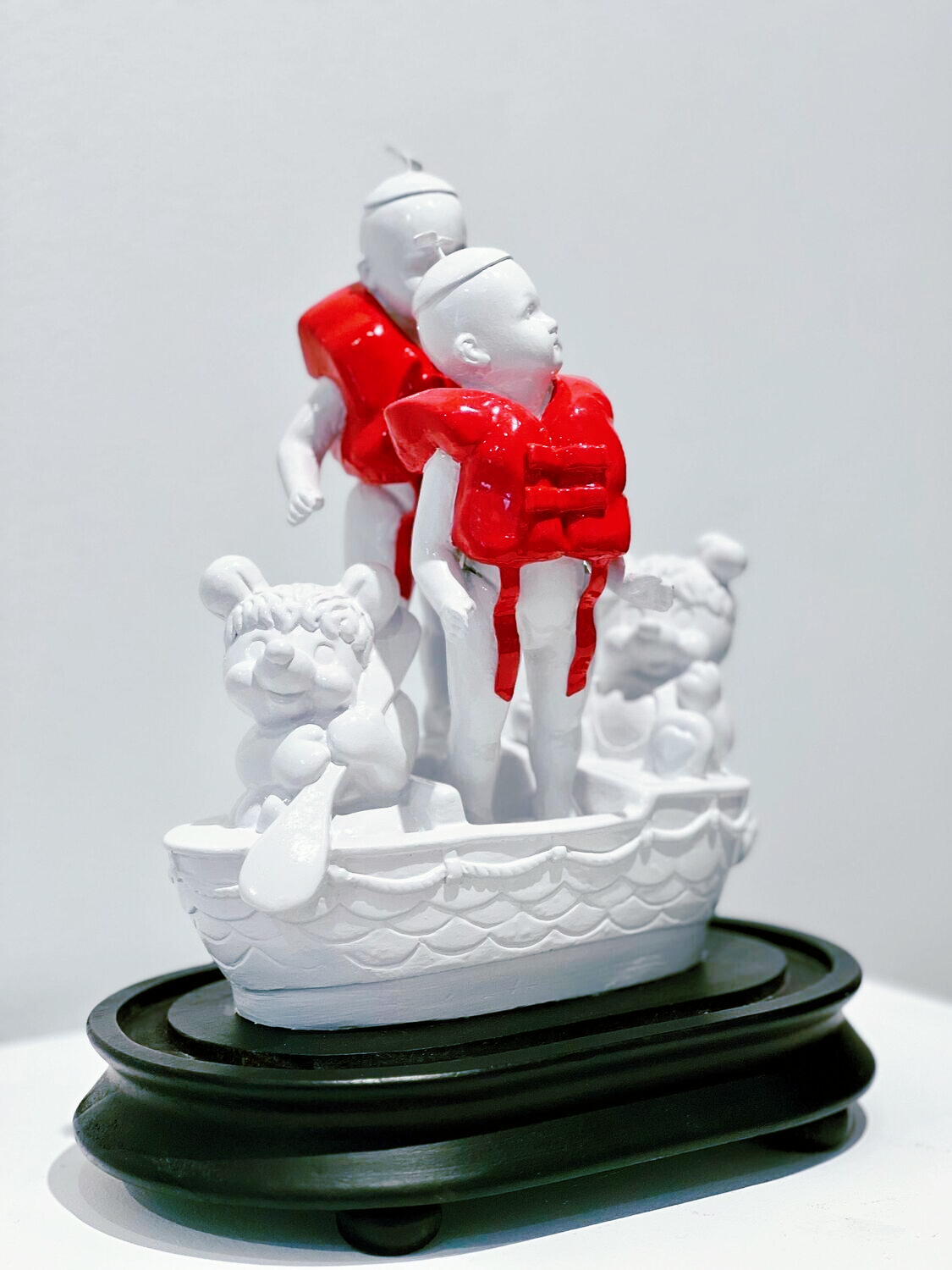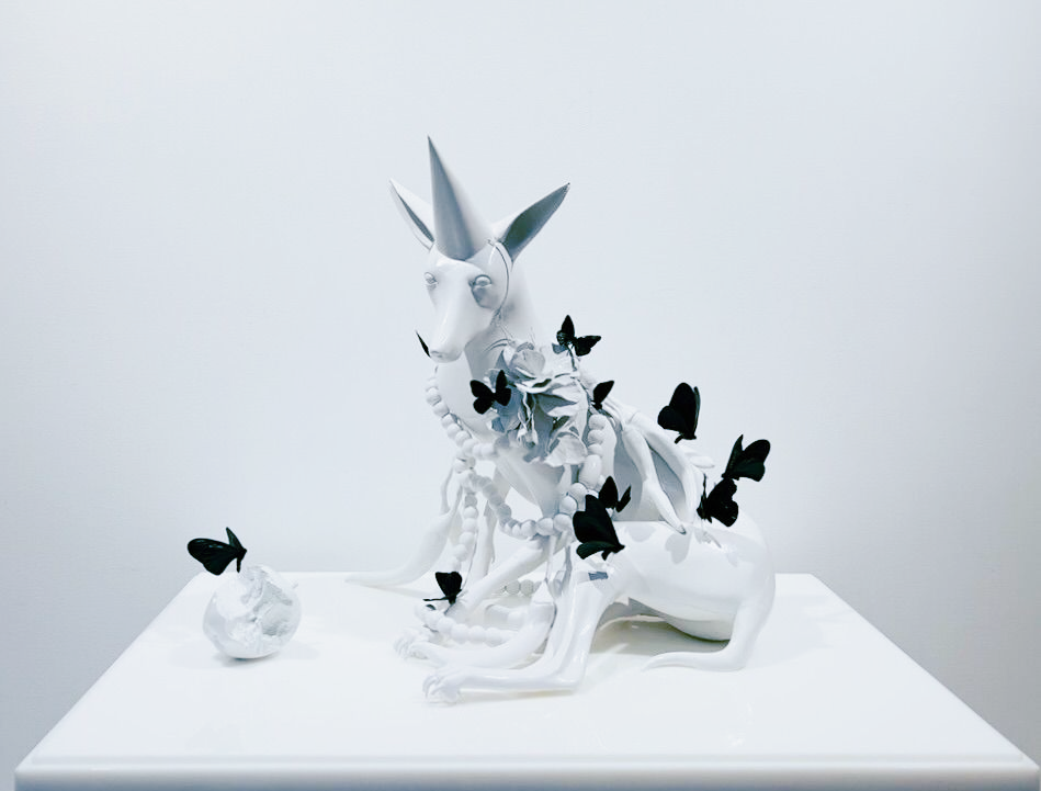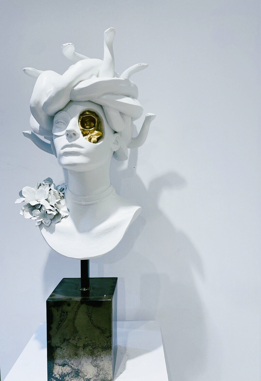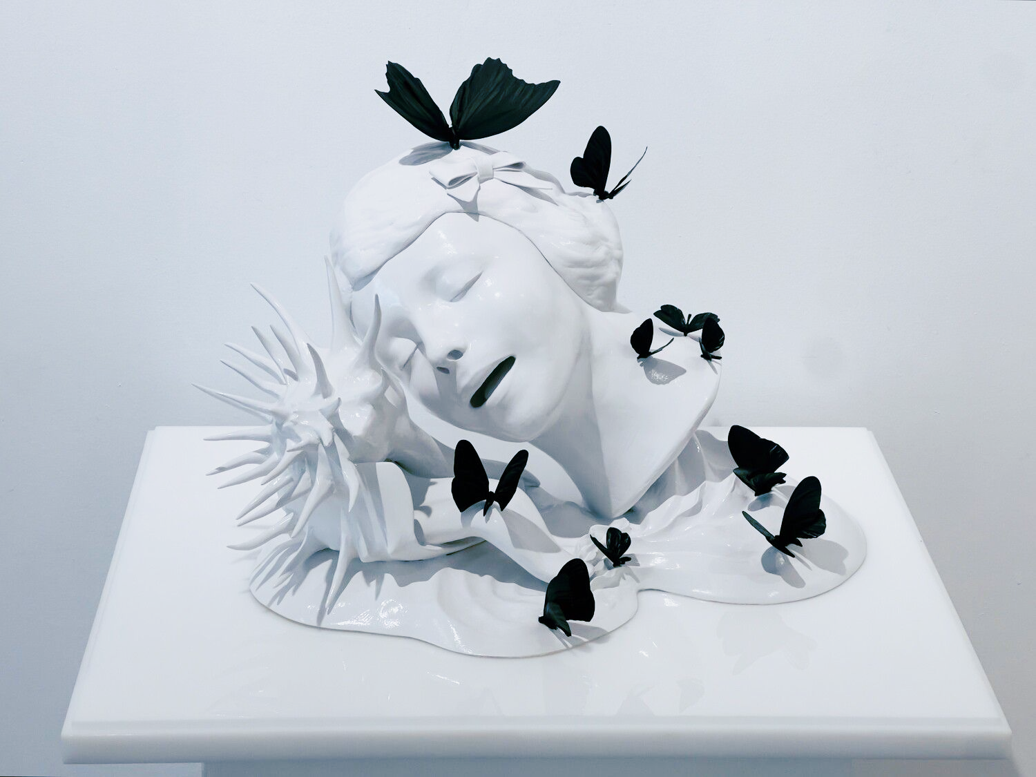 Several contradictory themes are explored, such as delicacy and fragility, sustainability versus the evanescence of beings and things. The silence of these scenes exudes the beauty of the materials that confront each other: the finesse of the shapes and the roughness of the materials that compose them (plaster, textile fibers, metal, etc.).