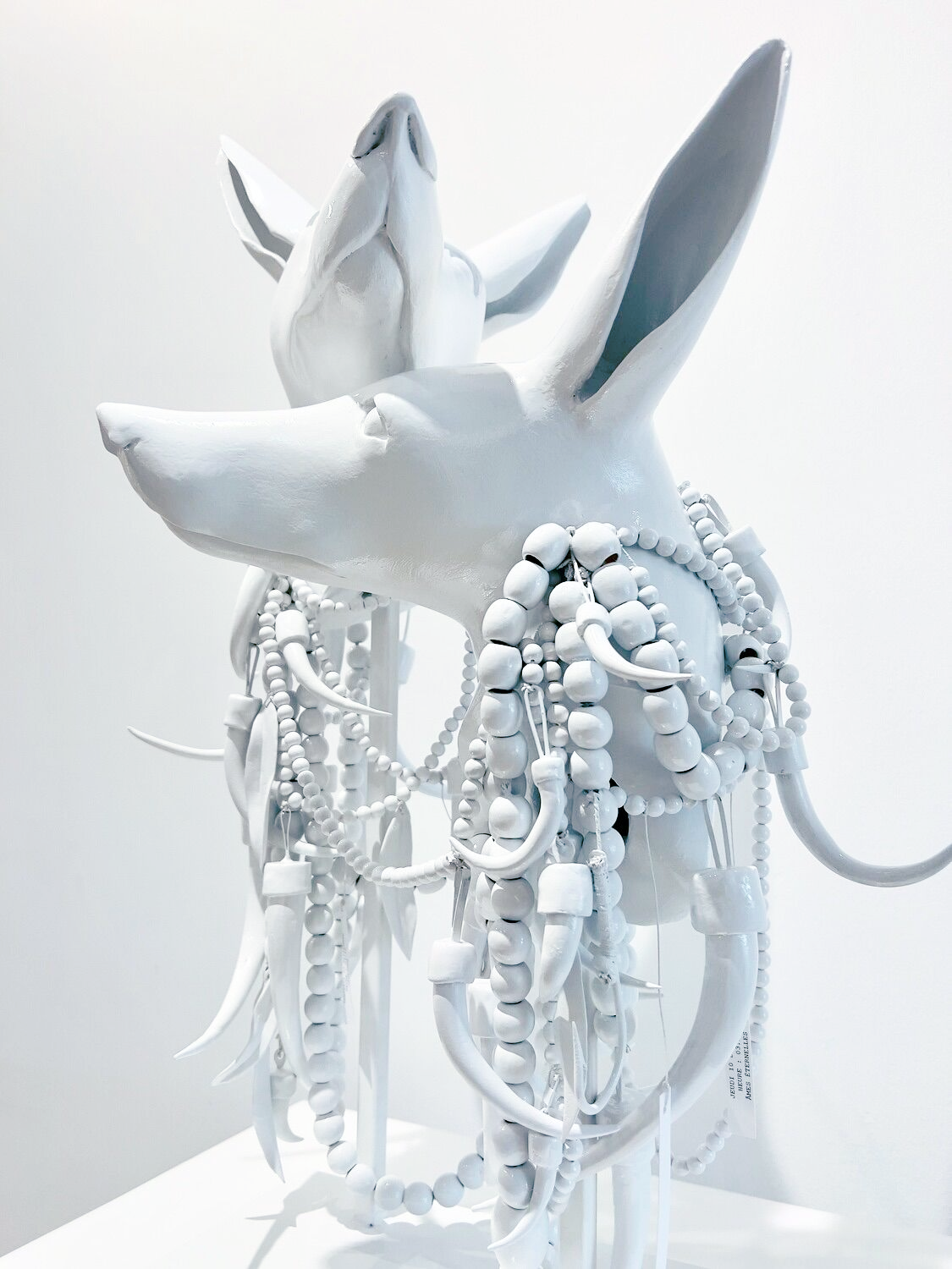 Scenographer for several years and puppet designer, inspired by the strength and sensitivity of the work of artists such as Anselm Kiefer, Berlinde de Bruyckere and Louise Bourgeois, she imagines an evolving sculptural series of characters and animals that she transposes into poetic universes imbued with theatricality.