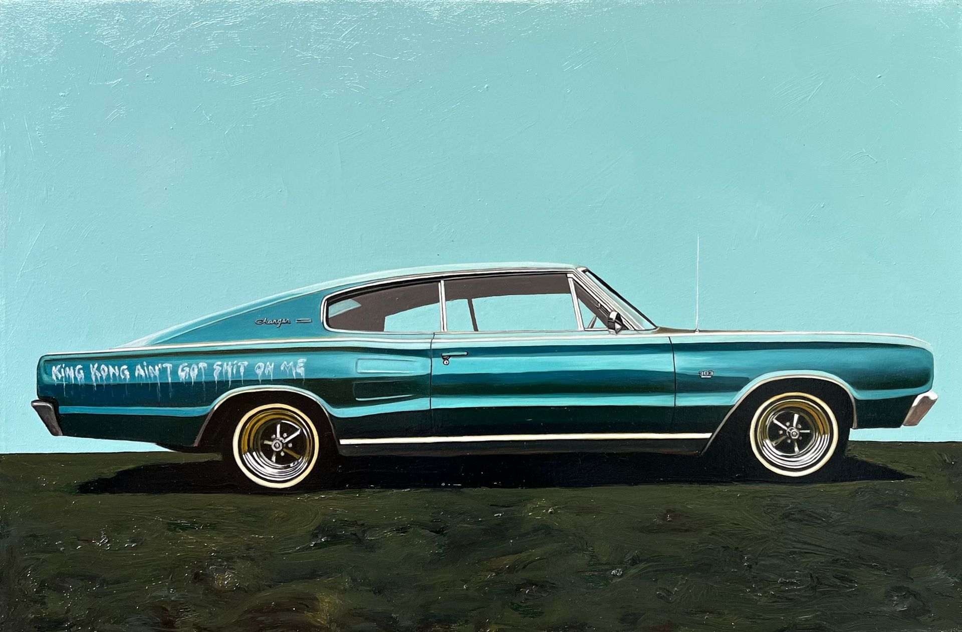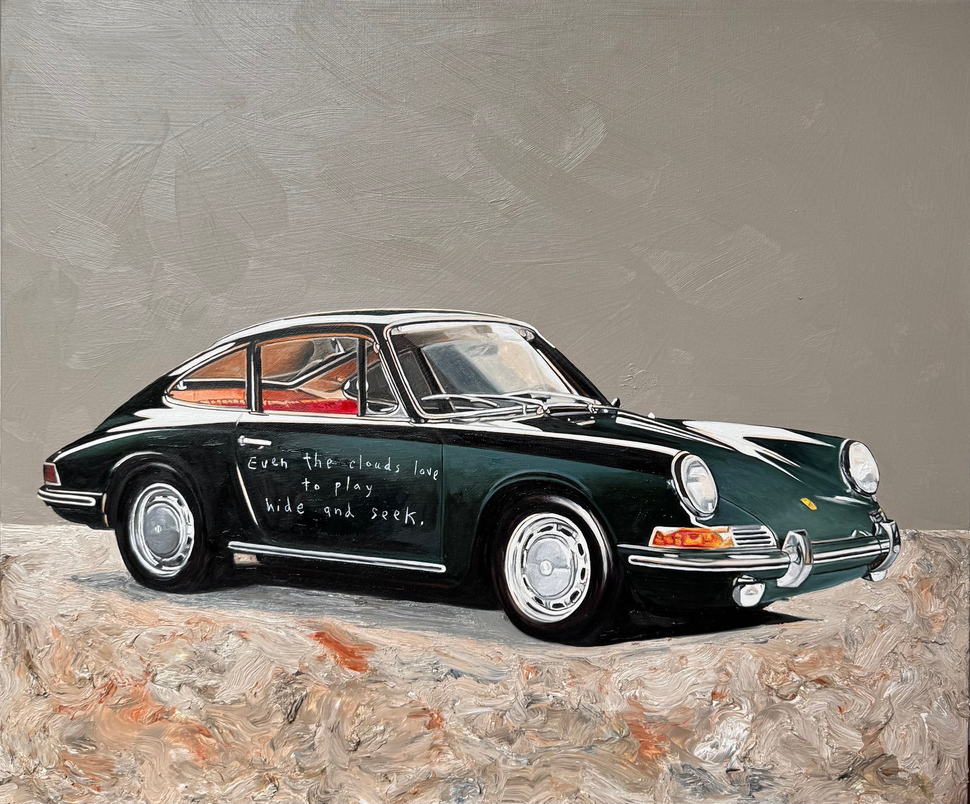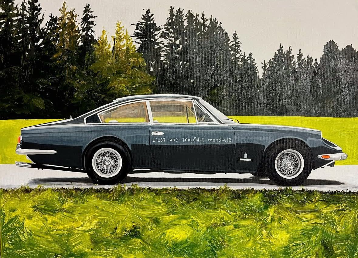 Amoncèlements de peinture à l’huile et flaques de liquin épandus sur la palette, toiles enduites de gesso, chevalet reposant sur un tapis modeste ainsi que quelques néons charpentent son atelier. À main levée, l’artiste dessine les premières lignes de la composition, s’aidant d’un quadrillage en tiers et d’un bâtonnet de fusain. À cette étape, il fait abstraction de ce qui dérange, allant jusqu’à soustraire l’environnement autour du sujet. Si les objets de seconds rôles racontent une histoire, les vides accompagnateurs guident le regard sur l’essentiel.